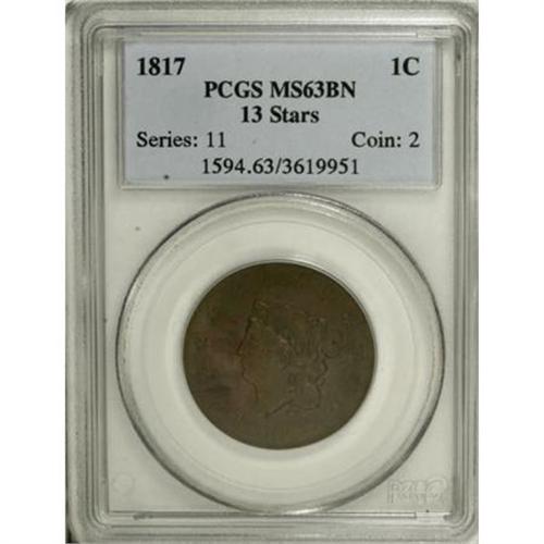 <B>1817 1C 13 Stars MS63 Brown PCGS.</B></I> N-14, R.1. Lustrous dark brown surfaces show some lighter olive and tan, with maroon patina in the left obverse field. EAC 50.<BR><I>Ex: September Long Beach Auction (Heritage, 9/2004), lot 5071</B></I>.<BR><BR><B>Coin Engraver:</B> Robert Scot or John Reich<BR><BR><b>Shipping:</b> Coins & Currency (<a target="_blank" href="http://www.heritageauctions.com/common/shipping.php">view shipping information</a>)