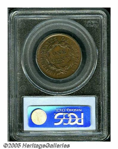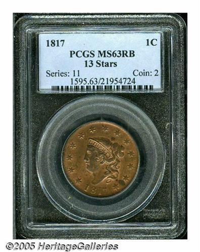 <B>1817<1C> 13 Stars MS63 Red and Brown PCGS.</B></I> N-14, R.1. The obverse is more Red than Brown, although small spots are noted near stars 8 and 12. The reverse has mostly mellowed in light brown hues, but some original gold color remains near the rims. Well struck on the left side, the right side is typically defined. A few moderate marks are on the portrait.