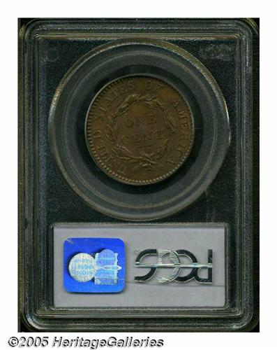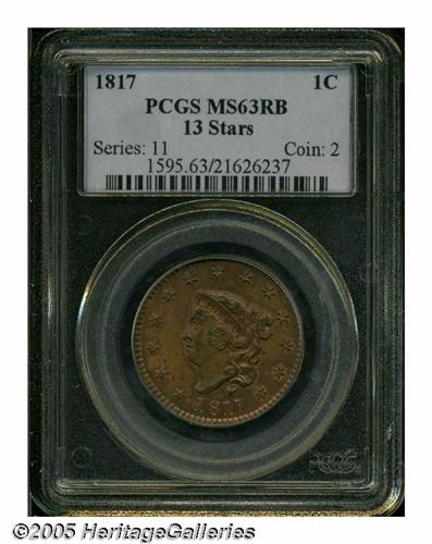 <B>1817<1C> 13 Stars MS63 Red and Brown PCGS.</B></I> N-6, R.1. Attributed by the 817 being close, the doubled denticle just to the right of star 1, the Y in LIBERTY being low, and the letters AME in AMERICA touching. The patina is light orange-tan, and the design elements are well struck, though the star centers along the left border are weak. A few tiny marks are noted on Liberty's cheek and in the left (facing) obverse field. Population: 25 in 63, 12 finer (4/05).