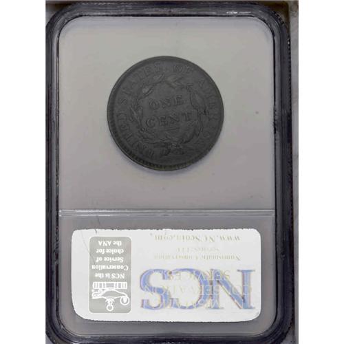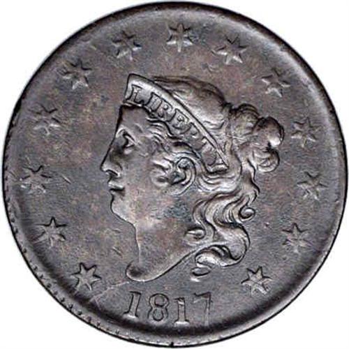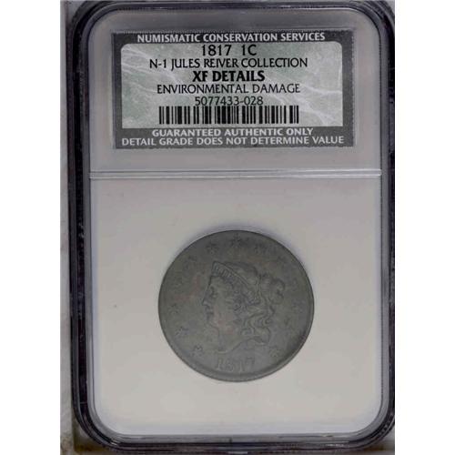 <B>1817<1C> 13 Stars. N-1, R.4--Environmental Damage--NCS. XF Details. VF30 EAC.</B></I> An attractive example with mottled light and darker brown, including splashes of steel-brown color. The surfaces are moderately rough, as usual for this variety. This is a later die state with the obverse cracks heavier than the previous example, and the rim break over AM about equally visible. Obverse dentilation is weakly defined and nearly gone, with wide border dentils at the left side of the reverse and weak at the right, a result of slightly mis-aligned dies. This centering problem is almost identical to that of N-16, which shares this reverse die. Apparently, the old obverse was replaced with the new obverse, during which there was no adjustment to the reverse die.<BR><I>Ex: Dr. George French; Thomas Gaskill; John Schreuder; New Netherlands (50th Sale), lot 1336; Del Bland.</B></I> Envelope Included.