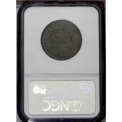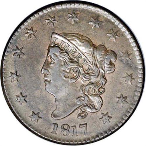 <B>1817<1C> 13 Stars. N-2, R.3. AU55 NGC. VF35 EAC.</B></I> An early die state without evidence of the die cracks that develop during this marriage and carry over to N-1, which shares the obverse die. The reverse has a light die crack radially from the border through S1 and the wreath, toward O of ONE, but not reaching that letter. Both surfaces have some remaining luster, with a blend of tan, olive, and steel-brown colors. Although a few typical surface marks are present, there are none of the heavy marks that sometimes plague these issues.<BR><I>Ex: George Ramont (5/1/1968).</B></I> Envelope Included.