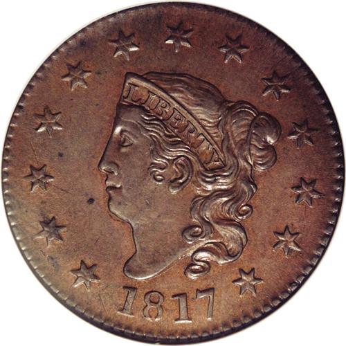 <B>1817<1C> 13 Stars. N-3, R.2. MS61 Brown NGC. AU50 EAC.</B></I> An early die state, sans mouse. Golden-tan surfaces with olive color and splashes of darker patina. An attractive example with only a trace of corrosion on the reverse.<BR><I>Ex: Garry Fitzgerald (11/13/1968).</B></I> Envelope Included.