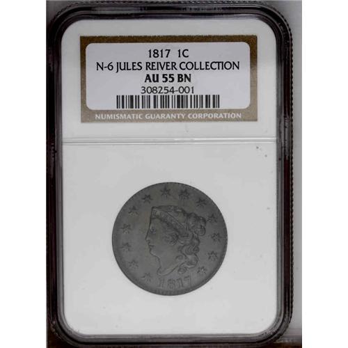 <B>1817<1C> 13 Stars. N-6, R.1. AU55 NGC. VF30 EAC.</B></I> Late die state with reverse letters drawn to the rim by flowlines. Little dentilation remains visible. Pleasing dark steel color with lighter brown on the obverse.<BR><I>Ex: Garry Fitzgerald (11/13/1968).</B></I> Envelope Included.