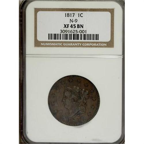 <B>1817 1C 13 Stars XF45 NGC.</B></I> N-9. NGC Census: (9/208). PCGS Population (8/151). Mintage: 3,948,400. Numismedia Wsl. Price for NGC/PCGS coin in XF45: $188. (#1594)<BR><BR><B>Coin Engraver:</B> Robert Scot or John Reich<BR><BR><b>Shipping:</b> Coins & Currency (<a target="_blank" href="http://www.heritageauctions.com/common/shipping.php">view shipping information</a>)