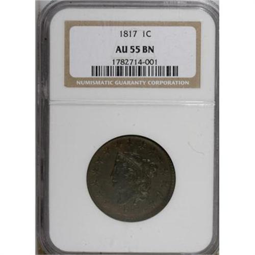 <B>1817 1C 15 Stars AU55 NGC.</B></I> N-16, High R.1. The only 15 Stars variety for the year, as only one reverse die was paired with the distinctive obverse. The rose-tinged chocolate-brown surfaces have excellent visual appeal and strong central detail, though the lower left stars are soft. EAC 45.<BR><BR><B>Coin Engraver:</B> Robert Scot or John Reich<BR><BR><b>Shipping:</b> Coins & Currency (<a target="_blank" href="http://www.heritageauctions.com/common/shipping.php">view shipping information</a>)