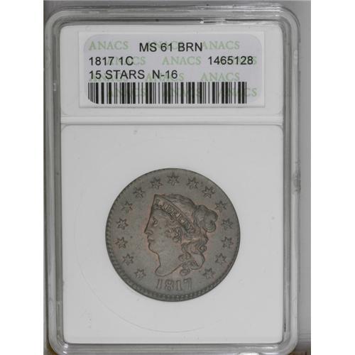 <B>1817 1C 15 Stars MS61 Brown ANACS.</B></I> N-16, R.1. Pleasing light brown with hints of reddish-orange color around the devices on both sides. The reverse has hints of bluish toning. A small area of dark brown toning is visible between TY, and the surfaces have minor hairlines and other small abrasions. The reverse is rotated counterclockwise as usual. EAC 40.