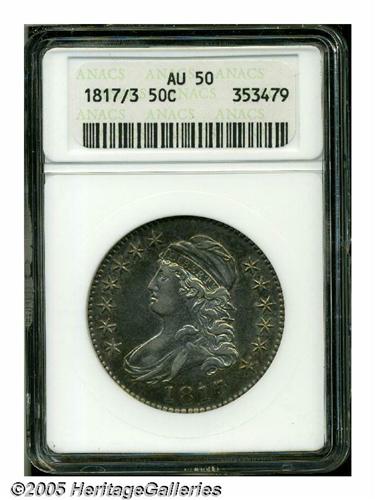 <B>1817/3<50C> AU50 ANACS.</B></I> O-101a, R.2. Among the more obvious overdates within the Half Dollar series, the lower loop of the 3 is unmistakable to the naked eye. Golden-brown, magenta, and cobalt-blue patina gravitates to the borders of this nicely defined specimen. A few minute marks are scattered over each side.