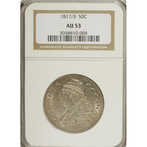 <B>1817/3 50C AU53 NGC.</B></I> O-101, R.2. While the 1817/4 is an ultra-rarity, the 1817/3 is readily collectible. The overdate is bold, and both sides exhibit multiple sets of clashmarks. The plentiful remaining luster is rose-tinged, and the cheek and bust truncation have only slight wear.<BR><BR><b>Shipping:</b> Coins & Currency (<a target="_blank" href="http://www.heritageauctions.com/common/shipping.php">view shipping information</a>)