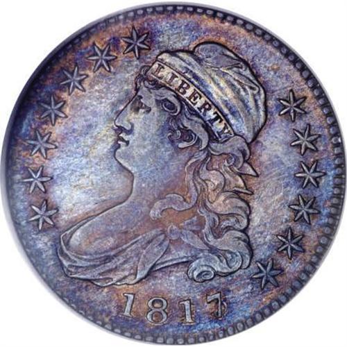 <B>1817/3 50C AU58 NGC.</B></I> O-101a, R.2. A spindly die crack from the olive leaves to the M in AMERICA identifies the later die state. Deep cobalt-blue, orange, and olive-gold envelop this unabraded overdated half. Liberty's forehead and curls exhibit moderate wear. Struck from multiply clashed dies.<BR><BR><B>Coin Engraver:</B> John Reich<BR><BR><b>Shipping:</b> Coins & Currency (<a target="_blank" href="http://www.heritageauctions.com/common/shipping.php">view shipping information</a>)