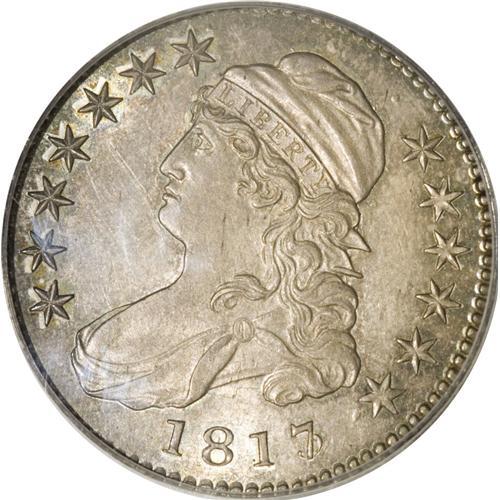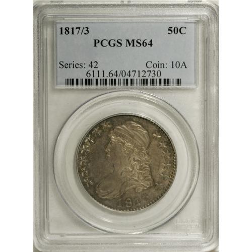 <B>1817/3 50C MS64 PCGS.</B></I> O-101, R.3. This piece is from the famous Eliasberg Collection that this cataloger had the pleasure of describing a decade ago. It is a sharply struck example of the scarcer early die state with no evidence of the reverse die crack that is commonly seen. This piece has splendid original golden-brown toning with peripheral iridescence over fully lustrous and lightly reflective surfaces. A few faint hairlines can be seen in the fields, especially on the obverse. Noticeable clash marks can be seen on the reverse. The 1817/3 overdate is a popular variety with collectors, as the overdate features are easily visible, even without magnification. It is such "naked eye" varieties that garner the most attention among collectors. Although we are certain that this coin is not the finest known example of the variety, we are equally certain that it is in the Condition Census that includes the six finest known pieces. It is the finest certified by PCGS, with only three finer coins graded by NGC. Population: 2 in 64, 0 finer (12/06).<BR><I>Ex: John G. Mills Collection (S.H. and H. Chapman, 4/1904); J.M. Clapp; Clapp Estate; Louis E. Eliasberg, Sr. Collection; Eliasberg Estate (Bowers and Merena, 4/1997), lot 1734; Juan Suros Collection (Superior, 2/1999), lot 179; Goldberg Coins (9/2005), lot 1712.</B></I><BR><I>From The Rocky Top Collection of Bust Half Dollars.</B></I><BR><BR><b>Shipping:</b> Coin/Currency (<a target="_blank" href="http://www.heritageauctions.com/common/shipping.php">view shipping information</a>)