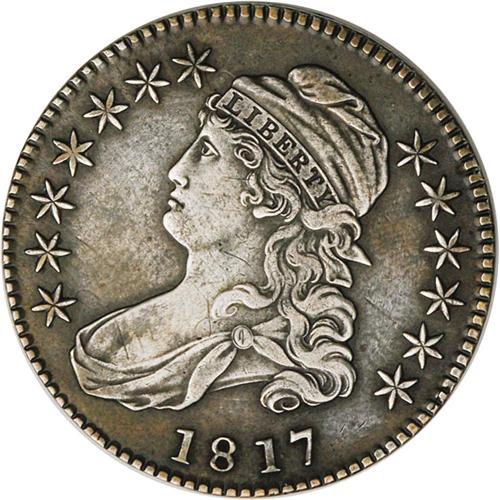 <B>1817<50C> 181.7--Improperly Cleaned--NCS. XF40.</B></I> O-103, R.2. The diagnostic round die-defect dot is visible just to the right of the second 1 in the date. The surfaces have retoned a light to medium gray after a light cleaning. Sharply defined, and free of significant abrasions. A few minor marks on Liberty's chest are mentioned for accuracy.<BR><I>Ex: Rufus Stewart (3/19/1991).</B></I> Envelope Included.