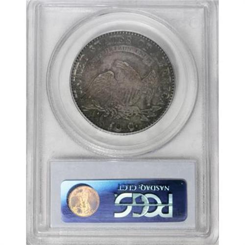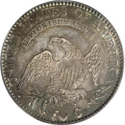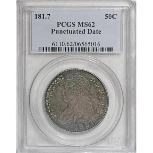 <B>1817 50C 181.7 MS62 PCGS.</B></I> O-103, R.2. A rotated double strike, noticeable on LIBERTY, the top of the cap, the left (facing) claw, and the denomination. LIBERTY is unusually large, while the 50 is made slender by the pronounced strike doubling. Deep jade-green and mauve toning blankets this unabraded and satiny example. The strike is a bit soft on the neck curls and the right claw, although the stars are razor-sharp. Population: 2 in 62, 1 finer (6/07).<BR><BR><B>Coin Engraver:</B> John Reich<BR><BR><b>Shipping:</b> Coins & Currency (<a target="_blank" href="http://www.heritageauctions.com/common/shipping.php">view shipping information</a>\)