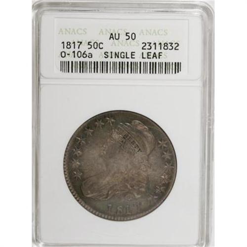 <B>1817 50C AU50 ANACS.</B></I> Single Leaf. O-106a. NGC Census: (25/201). PCGS Population (37/148). Mintage: 1,215,567. Numismedia Wsl. Price for NGC/PCGS coin in AU50: $304. (#6109)<BR><BR><B>Coin Engraver:</B> John Reich<BR><BR><b>Shipping:</b> Coins & Currency (<a target="_blank" href="http://www.heritageauctions.com/common/shipping.php">view shipping information</a>)