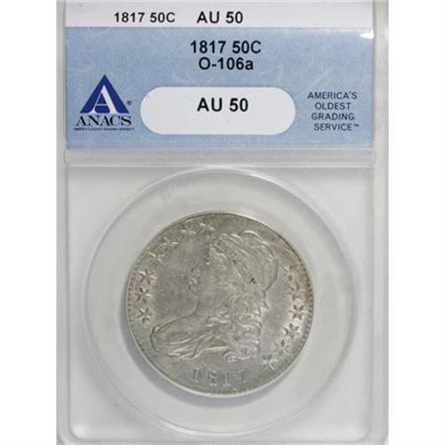 <B>1817 50C AU50 ANACS.</B></I> O-106a. NGC Census: (25/201). PCGS Population (37/151). Mintage: 1,215,567. Numismedia Wsl. Price for NGC/PCGS coin in AU50: $375. (#6109)<BR><BR><B>Coin Engraver:</B> John Reich<BR><BR><b>Shipping:</b> Coins & Currency (<a target="_blank" href="http://www.heritageauctions.com/common/shipping.php">view shipping information</a>)