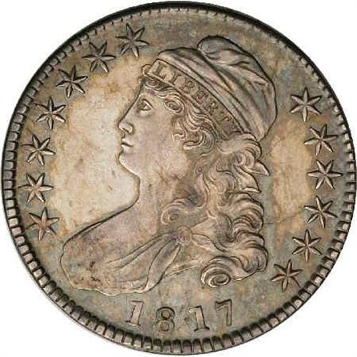 <B>1817<50C> AU50 NGC.</B></I> O-108, R.4. Same obverse die as used on O-107, except now a die crack extends from the rim between stars 8 and 9 to the top of the top ribbon, and another goes from the edge between stars 10 and 11 to the middle curl. Sharply defined, with splashes of cobalt-blue and gold-brown patination.<BR><I>Ex: Don Frederick (1/30/1980).</B></I> Envelope Included.