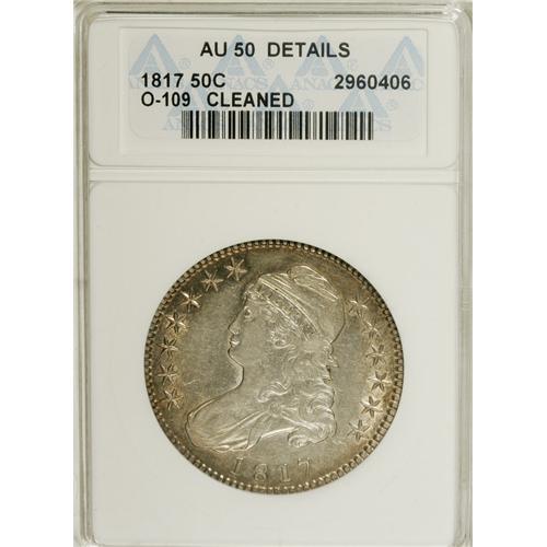 <B>1817 50C --Cleaned--ANACS. AU50 Details.</B></I> O-109. NGC Census: (27/213). PCGS Population (33/145). Mintage: 1,215,567. Numismedia Wsl. Price: $304. (#6109)<BR><BR><b>Shipping:</b> Coins & Currency (<a target="_blank" href="http://www.heritageauctions.com/common/shipping.php">view shipping information</a>)
