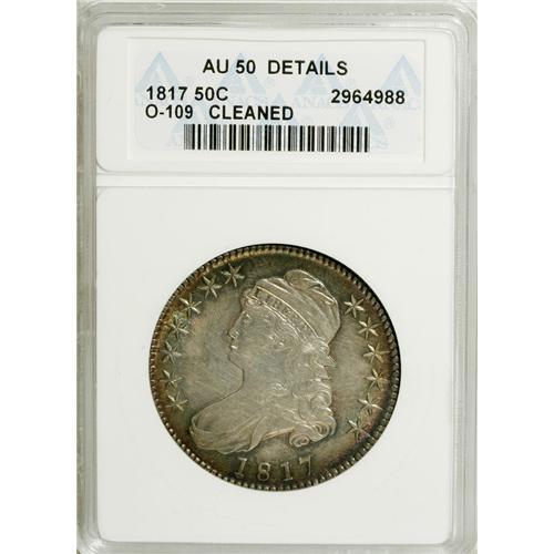 <B>1817 50C --Cleaned--ANACS. AU50 Details.</B></I> O-109. NGC Census: (27/213). PCGS Population (34/147). Mintage: 1,215,567. Numismedia Wsl. Price for NGC/PCGS coin in AU50: $304. (#6109)<BR><BR><b>Shipping:</b> Coins & Currency (<a target="_blank" href="http://www.heritageauctions.com/common/shipping.php">view shipping information</a>)