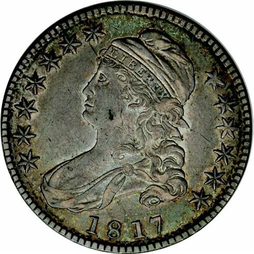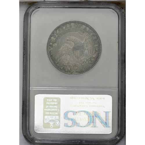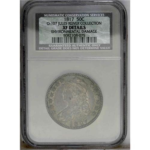 <B>1817<50C>--Environmental Damage--NCS. XF Details.</B></I> O-107, R.3. The recut C of 50 C. indicates that this specimen is from an early die state. The usually seen die crack that encircles most of the reverse periphery is not apparent on this specimen. However, the crack from the rim between the CA of AMERICA to the middle of the left (right facing) wing is visible. The surfaces are toned mauve-gray, and exhibit traces of luster in the protected areas. Minor corrosion is noted on the cheek and portions of the peripheries.<BR><I>Ex: Steve Levy (2/26/1979).</B></I> Envelope Included.