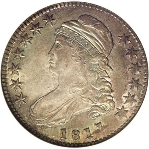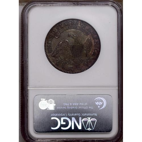 <B>1817<50C> MS62 NGC.</B></I> O-112, R.2. Vertical die lines near the throat confirm the Overton die marriage. A melange of cobalt-blue, orange-tan, and lavender toning bathes each side, and considerable luster is present in the recessed areas. The design elements are sharply impressed, though the centrils in the stars along the right border are weak. Several light handling marks on Liberty's cheek are concealed by the toning.