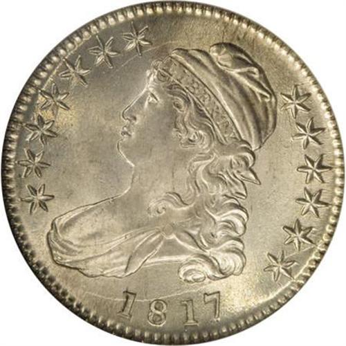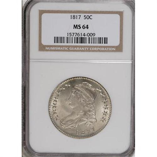 <B>1817 50C MS64 NGC.</B></I> O-113a, R.4. A scarce die marriage that is rarely encountered in near-Gem condition. Steve Herrman's <I>Prices Realized for Bust Half Dollars </B></I>(Autumn 2007) reveals that only two MS64 examples of this variety have crossed the auction block in the past 10 years, and only six Uncirculated pieces have been sold during the same period, regardless of numerical grade. Gleaming luster rolls across remarkably clean fields. One tick on Liberty's breast and a couple within the eagle's shield are all that apparently kept this coin from receiving a higher grading opinion by NGC. Census: 20 in 64, 10 finer, all varieties combined (12/07).<BR><BR><B>Coin Engraver:</B> John Reich<BR><BR><b>Shipping:</b> Coins & Currency (<a target="_blank" href="http://www.heritageauctions.com/common/shipping.php">view shipping information</a>)