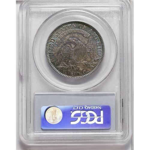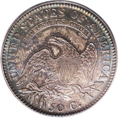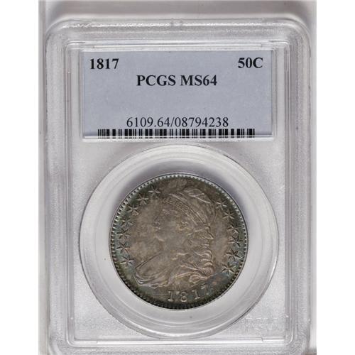 <B>1817<50C> MS64 PCGS.</B></I> O-113a, R.4. Ocean-blue, orange, and mauve patina embraces this crisply struck and shimmering near-Gem. A faint horizontal luster graze in front of the mouth is mentioned solely as an identifier. The pick-up point for Overton-113 is the "worm" beneath the beak. Various slender die cracks on both sides confirm the scarce late die state. Population: 11 in 64, 4 finer (8/06).