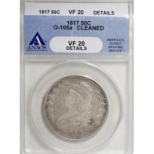 <B>1817 50C --Cleaned--ANACS. VF20 Details.</B></I> O-105 a. NGC Census: (2/304). PCGS Population (5/288). Mintage: 1,215,567. Numismedia Wsl. Price for NGC/PCGS coin in VF20: $82. (#6109)<BR><BR><B>Coin Engraver:</B> John Reich<BR><BR><b>Shipping:</b> Coins & Currency (<a target="_blank" href="http://www.heritageauctions.com/common/shipping.php">view shipping information</a>)