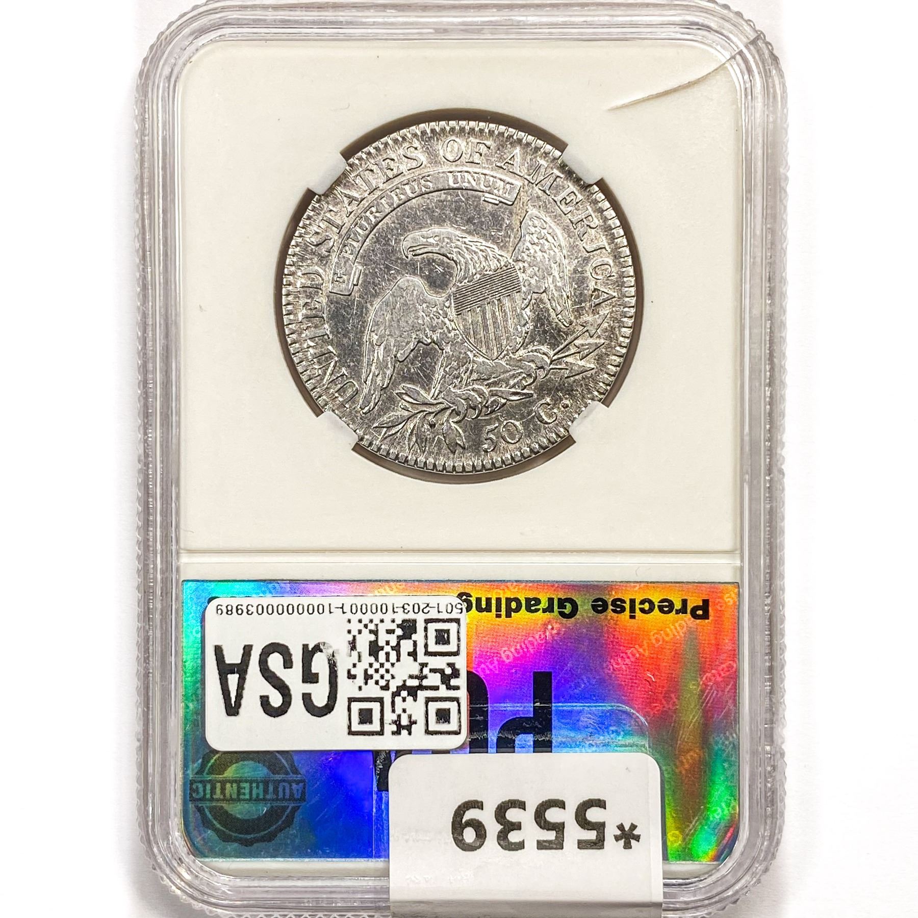 l. All non-certified coins and currency are guaranteed genuine, but are not guaranteed as to grade, since grading is a matter of opinion, an art and not a science, and therefore the description rendered by GSA or any third-party grading service may not agree with the opinion of others (including trained experts), and the same expert may not grade the same item with the same grade at two different times. GSA may, but is not obligated to, express an opinion as to non-certified numismatic items, in GSA’s opinion, or by its employees’ experience and the current interpretation of the American Numismatic Association’s standards as of the date the catalog was prepared. There is no guarantee or warranty expressed or implied that the grading opinions utilized by GSA, if any, will meet the standards of any grading service at any time in the future.