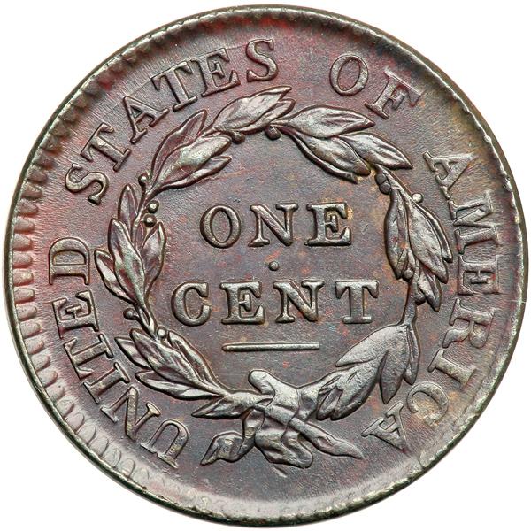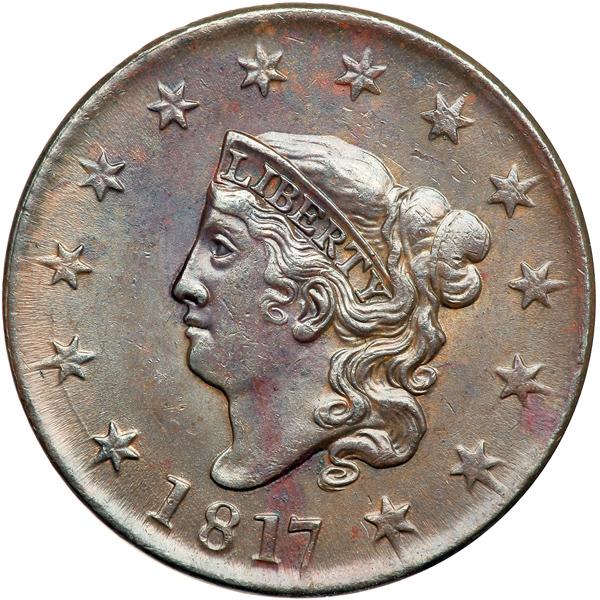 1817 Coronet Head Cent. PCGS graded MS-62 Brown. Lustrous reddish steel and olive brown, the reverse displaying more of the reddish tone that the obverse. (A good candidate for a color set of middle date cents.) No notable marks, just a subtle suggestion of rub on the highest points. M-LDS. The always present die crack that connects stars 1-3 is obvious and the obverse dentils are nearly gone while the dentils on the reverse, while dull, are nearly complete. A product of two well-used dies (N-15 obverse, later, mated with the reverse of N-4, later, and N-5, earlier). Most likely from the Randall Hoard of mint state cents. Our grade is AU58. Pop 1; 1 in 63; 1 in 65. Only 4 graded at PCGS for the variety. DWH #0431 (PCGS # 36589) .