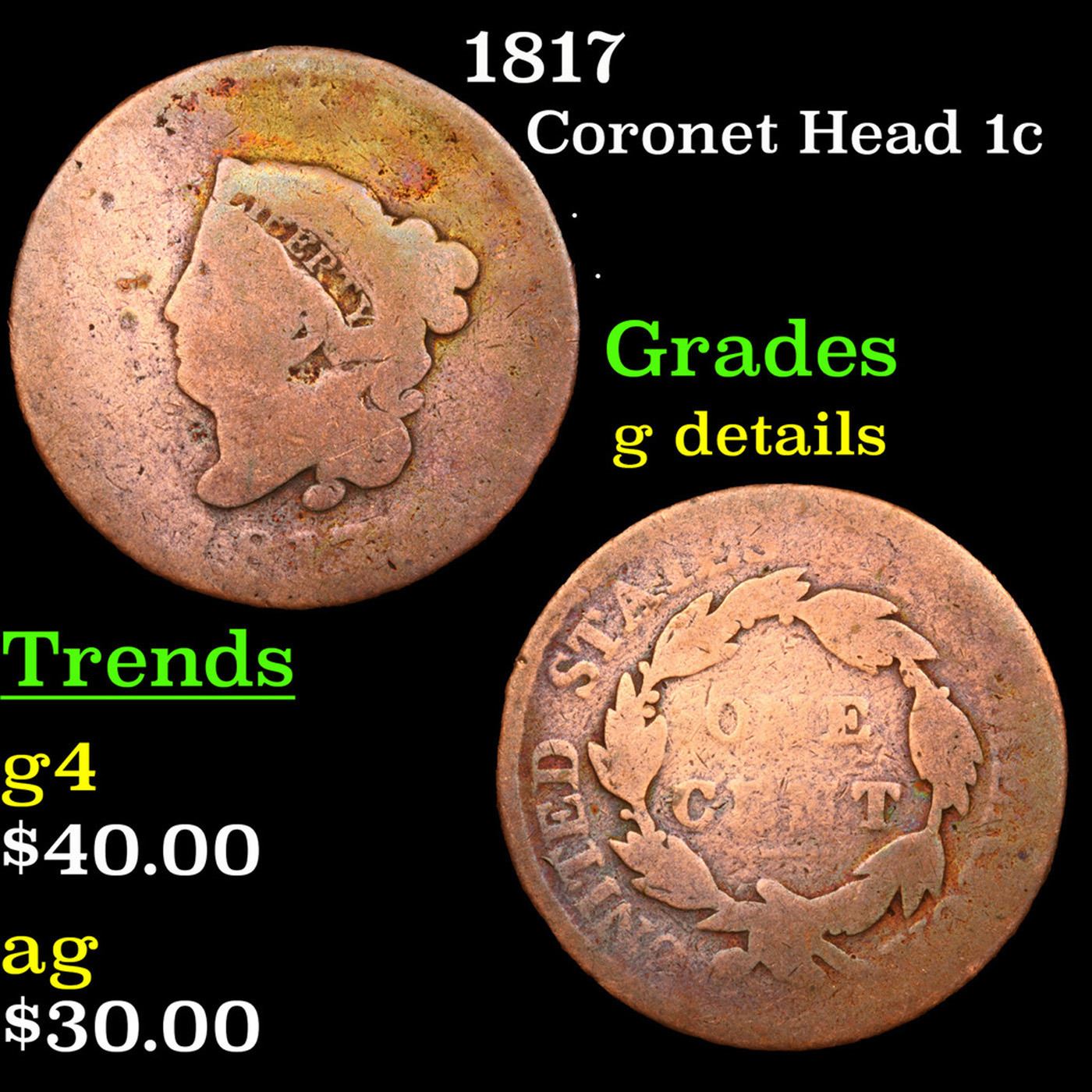 1817 Coronet Head Large Cent 1c Grades g details.