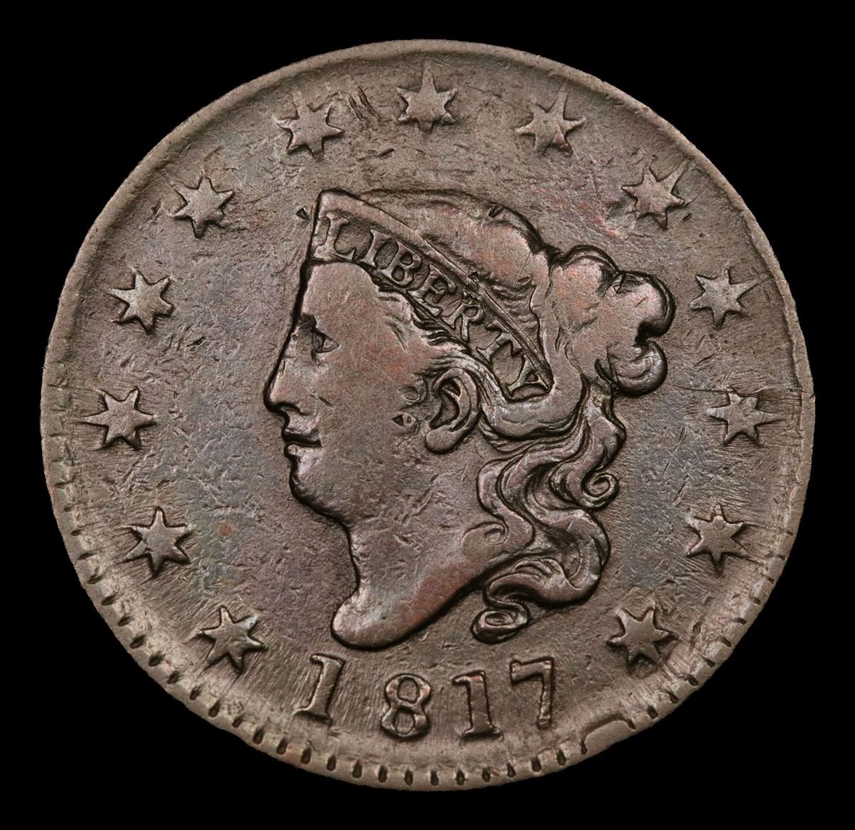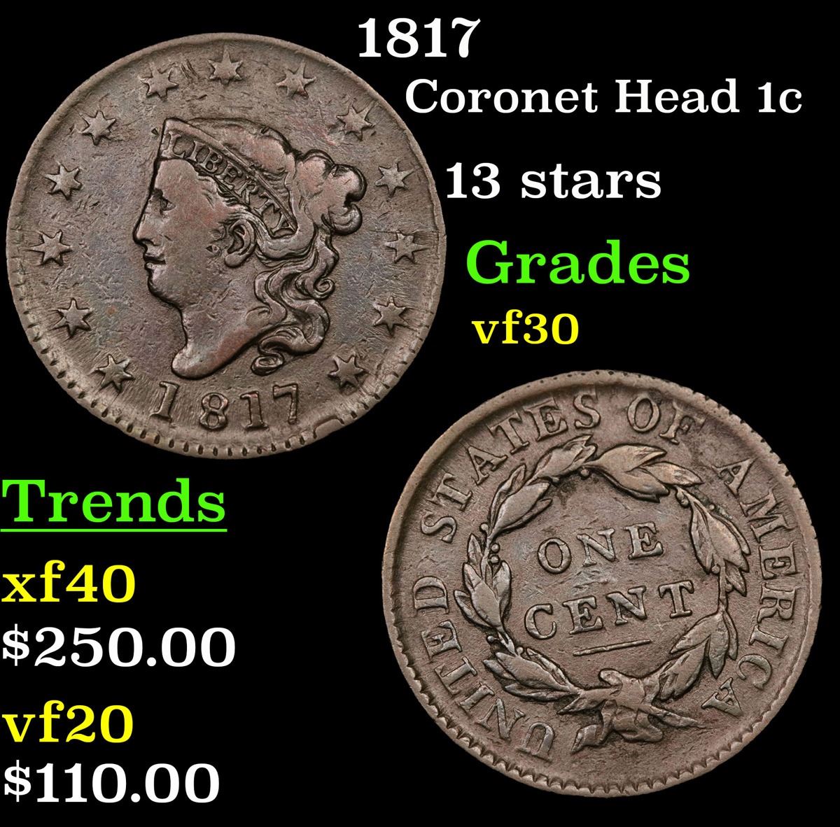 1817 13 stars . Coronet Head Large Cent 1c Grades vf++.
