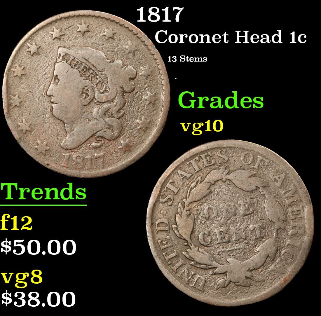 1817 13 Stems . Coronet Head Large Cent 1c Grades vg+.