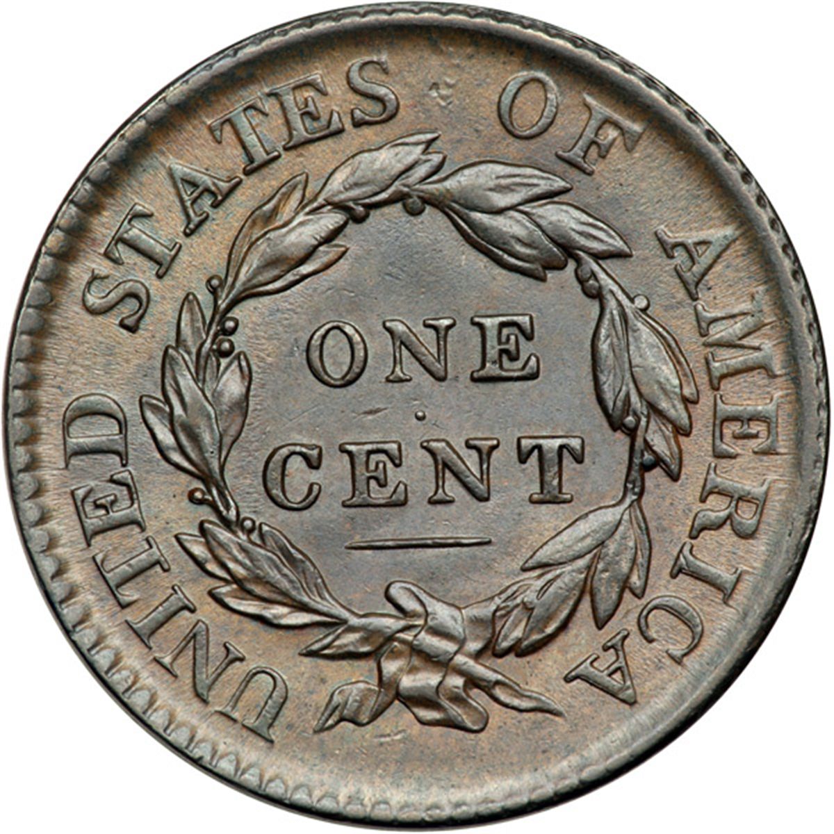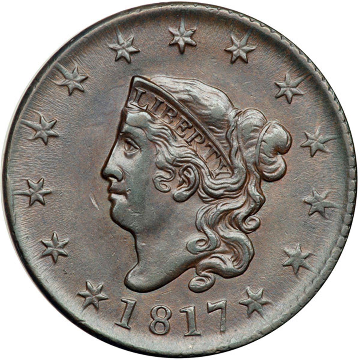 1817 N-10 R1 AU50. Frosty steel and olive brown with lighter steel brown toning in protected areas. Attractive satiny luster from microscopic die flowlines covers the fields on both sides. The only mark is a light diagonal nick in the field close before the chin. LDS. A thin but clearly defined rim cud shows at star 3 and the screw indents at S-O are dull but still visible. Only a few dull remnants of the obverse dentils are present as most have worn off the die.