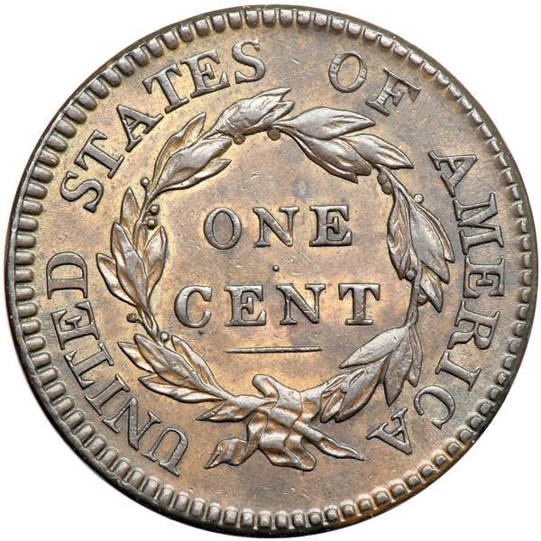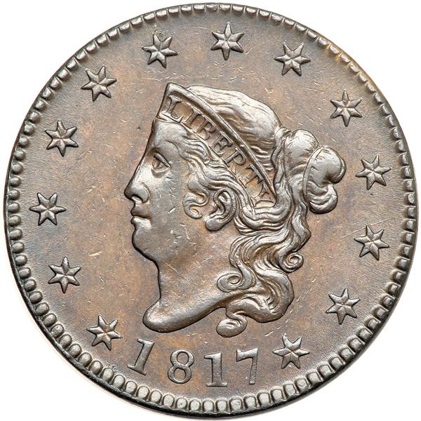 1817 N-10 R1. EF-45. Glossy chocolate brown and steel with underlying frosty golden tan and light brown in protected areas on the reverse. A couple tiny nicks on the cheek and a miniscule planchet flake under the C in CENT are the only marks. Sharp and attractive. E-MDS. The dentils are sharp, the fields are smooth, and there are no rim cud breaks or other die defects. DWH #0417.