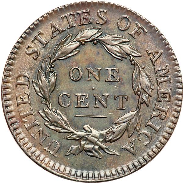1817 N-11 R1. EF-45. Glossy medium brown and light olive mottled with small splashes of darker olive brown on the obverse. Attractive cartwheel luster shows in the protected areas. A tiny nick midway between star 1 and the throat is the only notable contact mark. E-MDS. The dentils are crisp around both sides and the fields just starting to show fine flowlines. Struck very slightly off center to K-5. DWH #0421.