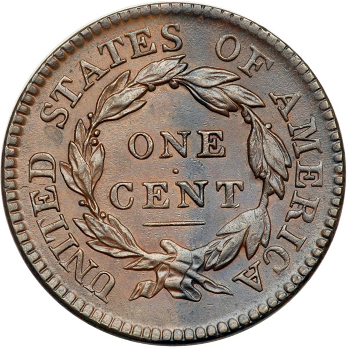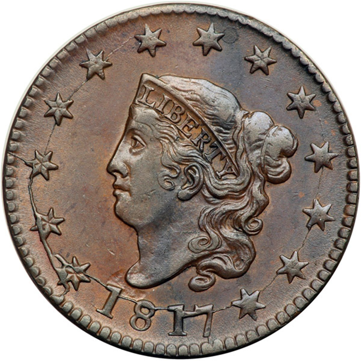 1817 N-12 R3 AU50. Glossy medium brown and darker chocolate, the right half of both sides the darker of the two colors. Frosty lighter steel brown toning shows in the protected areas on both sides and there are no notable contact marks or spots. A shallow low spot caused by debris on the die shows in the field at the bust tip, and the strike on the upper half of the hair buns is a bit weak, as usual on this variety. LDS with the obverse die cracks strong. A small internal cud break extends the left side of star 1 and the area outlined by die cracks at stars 1-3 is starting to sink as a retained cud. Ranked as high as CC#5 in the overall condition census for the variety but second finest known of the rare later die state (the finest of the die state is the slightly superior Newcomb:506-Starr:92 example). Called AU50 net EF40 in the Noyes census, his photo #20808. Bland says AU50 and CC#5 overall. Removed from a PCGS slab graded AU58 (PCGS label included, #36583.58/13079750, and it shows the attribution and Naftzger provenance). An important cent that comes with an impressive provenance.