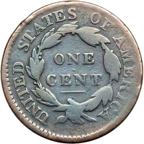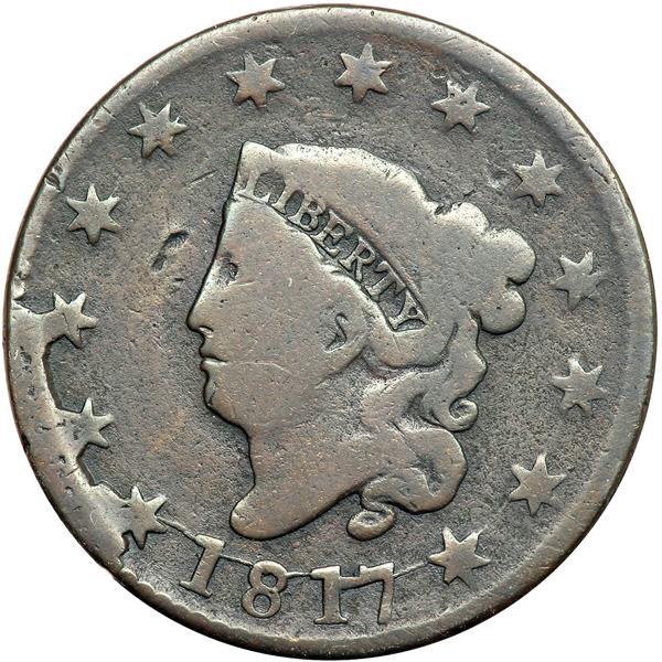 1817 N-12 R3. Good-5. Slightly sharper with microscopic granularity covering the fields, some fine horizontal hairline scratches across the top of the reverse, and a small rim bruise over the A in STATES. Medium brown and bluish steel brown, the highpoints rather glossy and the fields closer to matte. The reverse appears to have been lightly cleaned long ago. Extremely rare terminal die state with a large, strong cud break connecting stars 1-3 to the rim. There are only four confirmed examples in this die state with the large cud break, which is one of the largest in the Middle Date Cent series. Called VG7 net G5 and tied for CC#1 in the Noyes census, his photo #37211. The discovery coin, which was a similar grade, was sold to Dennis Mendelson in the sale after Jack Robinson, Superior 1/29/89:691, for $3740. DWH #1834.