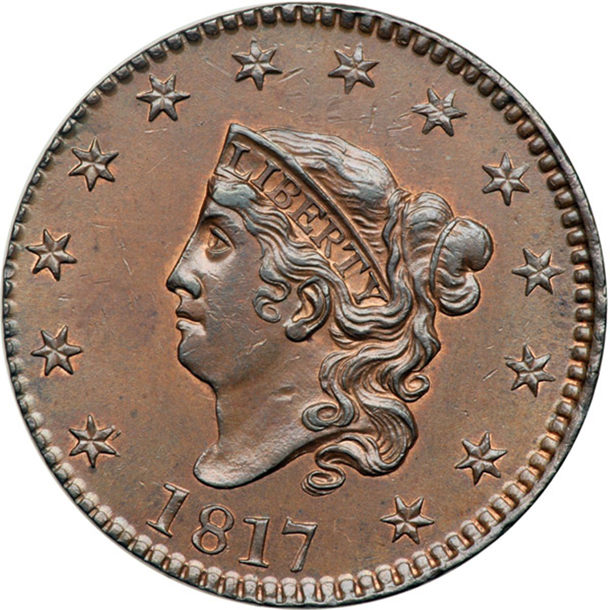 1817 N-13 R1 MS60+. Lustrous light steel brown with darker bluish steel overtones on the reverse and generous traces of the mint color remaining on both sides. The fields are smooth and glossy offering a hint of reflectivity thanks to new dies. No spots or stains. The only defects are a few minor nicks, including a couple left of star 8 and a shallow one in the center of the neck. Nicely struck EDS with a strong die line connecting the base of the I to the adjacent C in AMERICA. Most likely from the famous Randall Hoard of mint state cents discovered at the end of the US Civil War. Noyes photo #34670. An attractive cent that comes with a nice provenance.