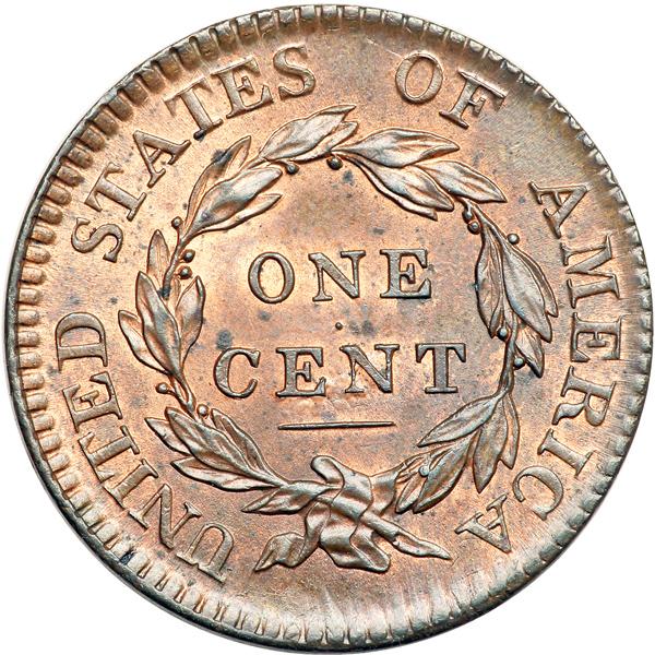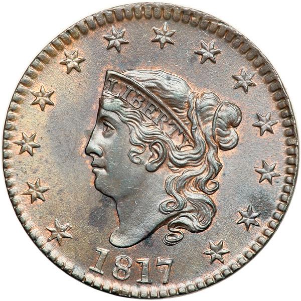 1817 N-13 R1. PCGS graded MS-64 Red & Brown. Lustrous bluish steel brown with 5% of the mint red remaining on the obverse, 30% on the reverse. A choice mint state cent except for a few small splashes of darker olive and steel toning, the notable ones in the field under the chin and over star 12. These tiny splashes of darker toning contain microscopic traces of very light verdigris or crud. Nicely struck E-MDS. The dentils are clear and complete around both sides and a strong die line joins the bases of the I & C in AMERICA. A sharp, attractive example of this Randall Hoard variety. Called MS61 and CC#5 in the Noyes census, his photo #37238. Comes with the original C. Douglas Smith collection envelope that is covered with his "story" of the acquisition, which came at a price of $1207.50 back in 1980. Doug called this piece "Sharp, lovely & totally irresistible." Our grade is MS60+. Pop 1; The only one graded in Red Brown at PCGS for the variety. DWH #0427 (PCGS # 36587) .
