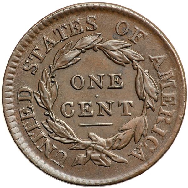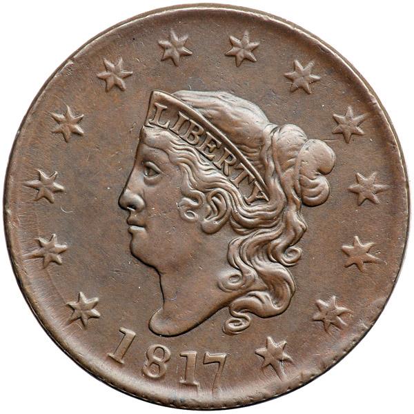 1817 N-14 R1 AU50. A mint state cent that was lightly cleaned and is retoned a very attractive glossy light chocolate and medium brown. No marks or other distractions. M-LDS. Most likely from the famous Randall Hoard of mint state 1816-1820 cents.