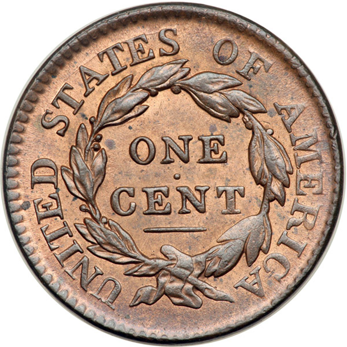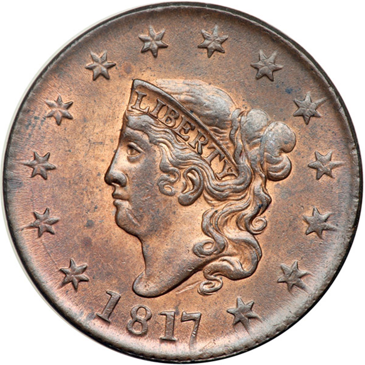 1817 N-14 R1 MS62+. Lustrous mint red fading to steel brown and chocolate on the devices. About a third of the mint color remains. This cent is choice except for a dull diagonal nick on the chin and another near the truncation above the 7. MDS with the usual weak strike on the upper half of the hair buns and on the leaves under IC in AMERICA. A very attractive cent, close to MS63. Most likely from the Randall Hoard of mint state cents. Called MS61 and tied for CC#6 in the Noyes census, his photo #56708. Removed from an NGC slab graded MS64RB (NGC label included, #446667-001, and it shows the attribution and Rasmussen provenance).