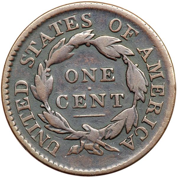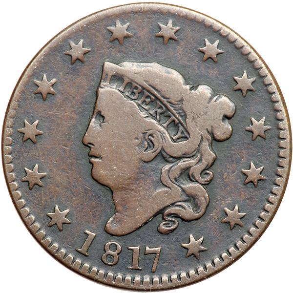 1817 N-15 R4- VG7. Rotated Reverse. VG-7. Glossy chocolate and olive brown with lighter chocolate brown toning covering the devices giving this cent an attractive two-tone appearance that accents the details. Smooth and very attractive, virtually perfect for the grade. EDS, before the usually seen die crack connecting stars 1-3. The reverse is rotated 140 degrees CCW relative to the normal head-to-foot die orientation. DWH #2368.