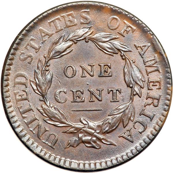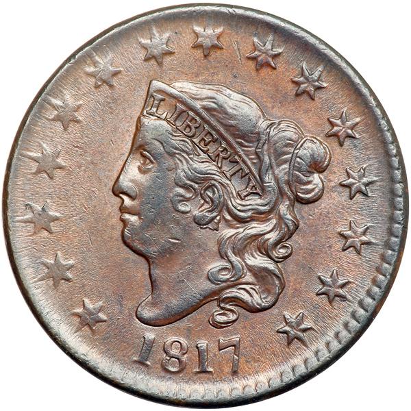 1817 N-16 R1 EF45+. 15-Star Obverse. Rotated Reverse. EF-45. Frosty light steel brown with darker steel brown toning on the highest points and mint luster covering the protected areas. Close to AU50, just a few trivial signs of light contact. The notable marks are a faint hairline on the chin and neck, a thin nick between stars 8 & 9, and three tiny ticks over the C in CENT. M-LDS. The rim cud at AM is strong and only half the obverse dentils remain visible. A subtle halo from die wear has formed around the portrait and the reverse is rotated 40 degrees CCW. DWH #0436.