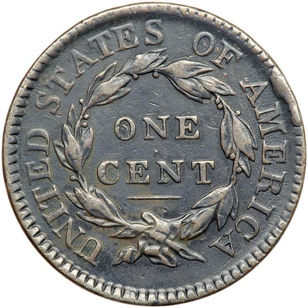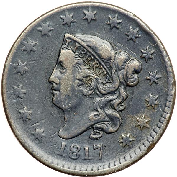 1817 N-16 R1 F15. 15-Star Obverse. Rotated Reverse. Fine-15. Five points sharper with a light rim bruise at star 10 and extremely fine roughness that slightly dulls the surfaces. Rather glossy dark steel with lighter steel brown highpoints. MDS. A strong, well-defined rim cud break shows over AM and the reverse is rotated 30 degrees CCW. DWH #2369.