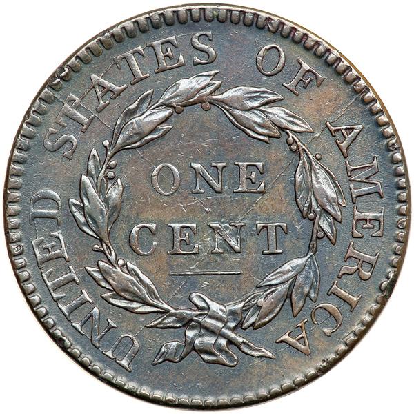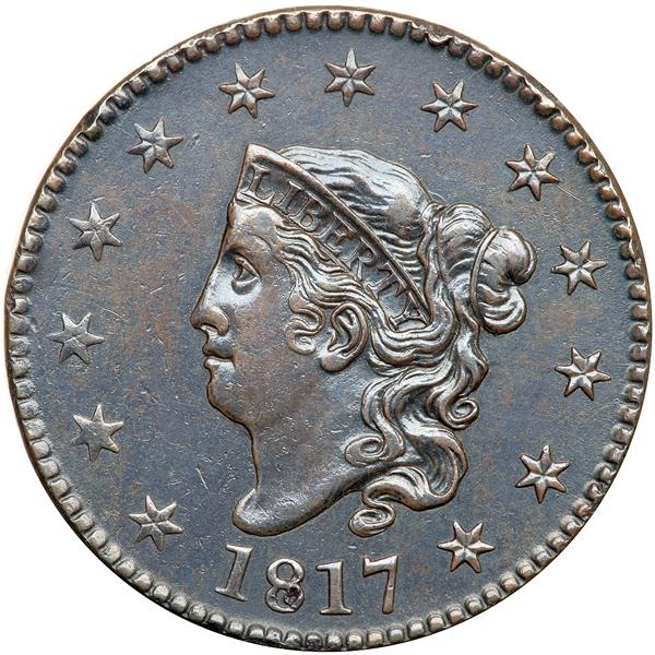 1817 N-17 R4 VF35. VF-35. Five points sharper but there is a small dig inside the bottom of the 8 in the date and a few small rim nicks on both sides, including one at star 5 and another over star 8. Attractive glossy dark chocolate and olive brown. No spots or stains. Sharply struck MDS. A die crack bisects the reverse from the first A in AMERICA to the U in UNITED, a radial die crack passes through the first T in STATES down to the O in ONE, and the right top of that T in STATES is clearly raised toward the rim. The die crack up to the dentils from the top of the E in STATES has not formed. Called EF45 net VF30 and tied for CC#8 in the Noyes census, his photo #28788. Bland says VF35 and tied for CC#8. Removed from a PCGS slab graded AU55 (PCGS label included, and it shows the attribution and Naftzger provenance). DWH #3533.