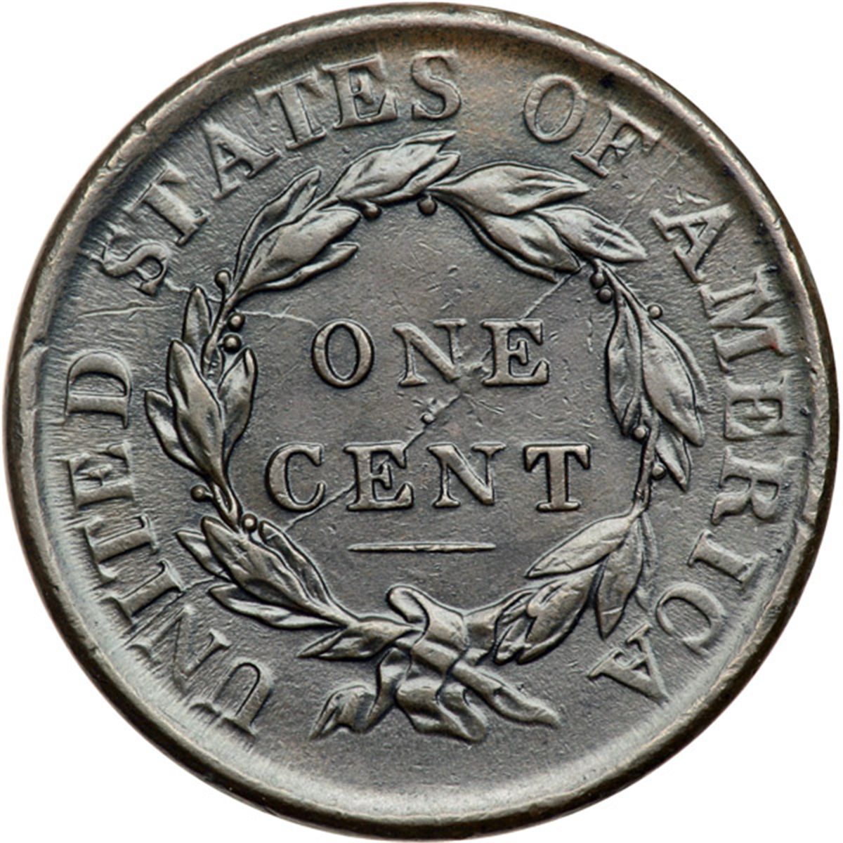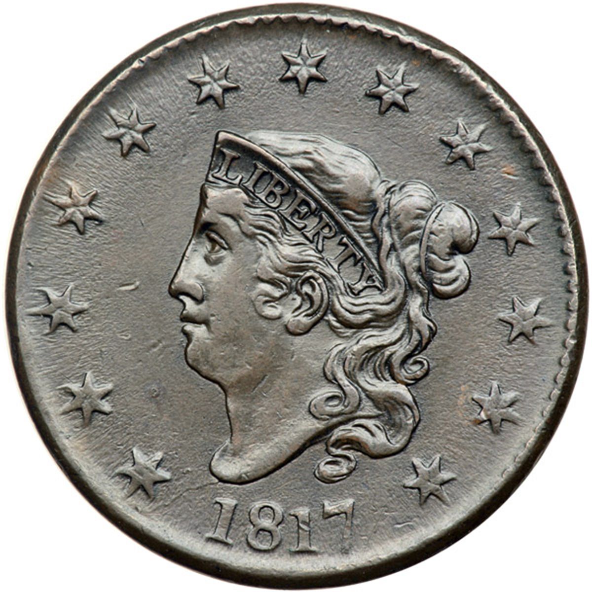 1817 N-2 R3 VF35. Glossy chocolate and olive brown. Smooth and very attractive, virtually flawless. The best identifying marks are a small spot of lighter brown toning near the dentils between stars 9 & 10 and a pair of tiny rim nicks over the first T in STATES. LDS with a clear bisecting die crack on the reverse from the rim right of the F in OF to the rim at NI in UNITED. The reverse is rotated 15 degrees CCW.