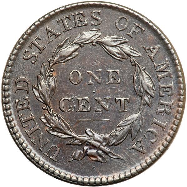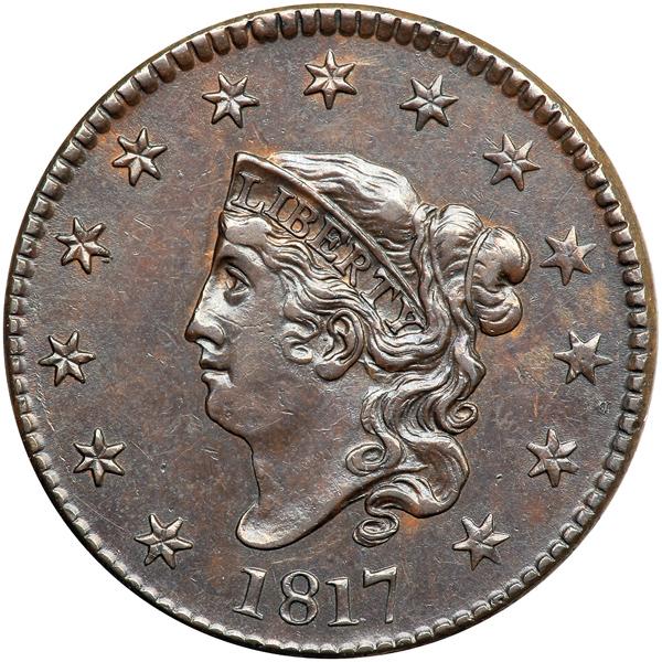 1817 N-2 R3. EF-40. Glossy chocolate brown with peeps of frosty light reddish brown toning faded down from mint color in some of the protected areas, mostly on the obverse. The only marks are a small pinprick near the dentils under star 11 and a dull nick down from the left end of the line below CENT, plus a few faint marks around the stem tip. A cent with outstanding eye appeal. Rare EDS, before the die crack down from the dentils through the first S in STATES to the wreath. The obverse fields are smooth and slightly reflective. DWH #3116.