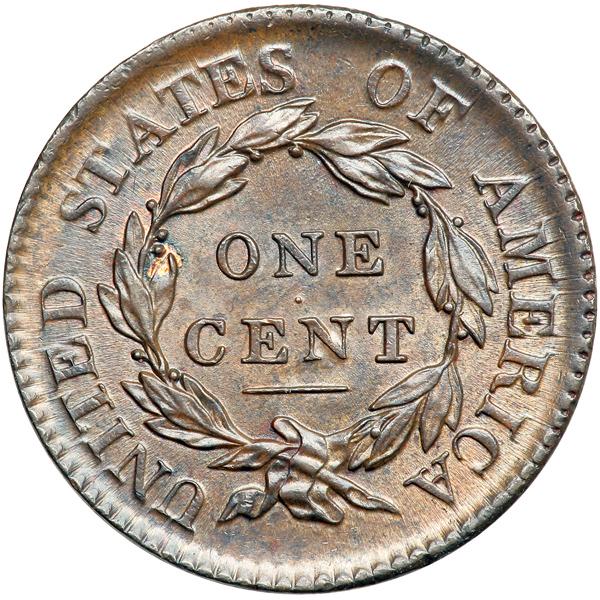 1817 N-3 R2 Full Mouse Break. PCGS graded MS-63 Brown. Lustrous steel brown with lighter golden brown toning covering much of the protected area on both sides and there are peeps of mint red remaining on the reverse. A splash of reddish brown toning covers much of the upper cheek and there is a small patch of reddish olive carbon in the field under star 7 down to the head. Just the barest touch of friction on the highpoints. A tiny diagonal nick under star 6 and a few small rim nicks at STAT are the only contact marks. LDS with a fully developed mouse break resting atop the head under star 8. Called MS60 net AU50 by Noyes, his photo #56698. At the lower end of the condition census for those examples known with the full mouse break. Our grade is AU58. Pop 1; 2 in 64; 3 in 65. DWH #2574 (PCGS # 36556) .