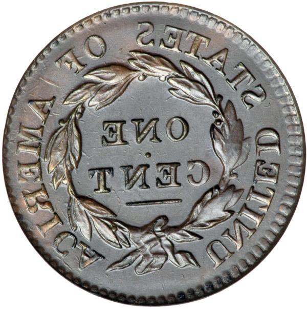 1817 N-4 R3+ AU50. Reverse Brockage. Choice glossy chocolate brown with frosty golden tan faded down from mint color in some protected areas. Virtually flawless with outstanding eye appeal. MDS. A fine die crack passes through the tops of ATES. The die state indicates this brockage was struck late in the N-4 marriage, before the N-14 or N-5 obverses were mated with this die. A fantastic example of this type of mint error, and it comes with an important provenance. DWH #0394.