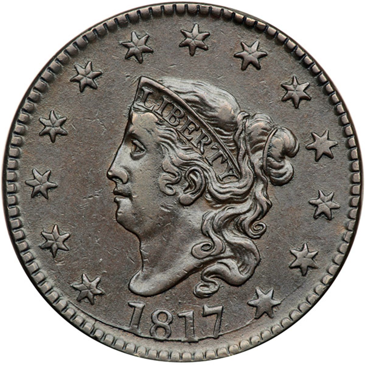 1817 N-4 R3+ VF35+. Choice glossy chocolate brown with traces of slightly lighter brown toning in protected areas on the reverse. A beautiful example for the grade, close to EF40. The only marks are a very light rim bruise above star 8 and a faint diagonal hairline scratch above CE in CENT. MDS. The always-present die crack through the base of the date is strong and a new radial crack connects that crack to the rim under the right point of star 1. A very pleasing example of this tough variety, and it comes with an impressive provenance.