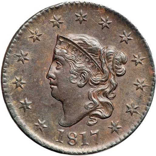 1817 N-5 R3 AU50. Lustrous chocolate and steel brown with lighter brown and tan faded down from mint color in the protected areas on both sides. Looks mint state but there is a hint of friction on the highest points of the portrait and a light rim bruise over star 6. Otherwise just a few tiny rim nicks on the reverse from flawless. MDS.